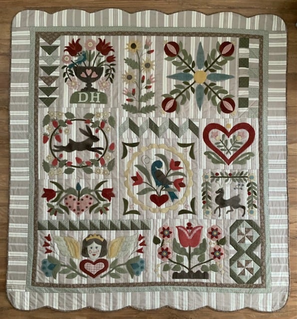 This kit includes all 15 colors of hand dyed wool to complete the applique for the Lancaster Co BOM. It also includes the French ticking stripe, brown print and two green print cotton fabrics to complete the quilt top and binding. All cotton fabrics are from my line Lavender & Lace with Marcus Fabrics. NO PATTERN - KIT ONLY